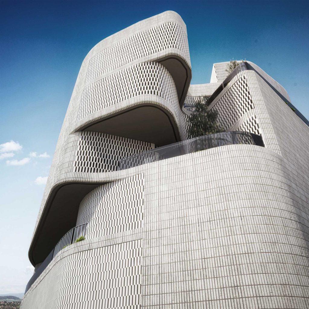 راهبرد اصلی طراحی بر بهرهگیری حداکثری از فرم موجود و حذف عناصر سازهای مزاحم در پیرامون سایت استوار بوده است. با حذف ستونها در مرز خارجی و بازتعریف ساختار باربر، امکان آزادسازی جدارهها و شکلدهی به پوستهای پویا فراهم شد. بدین ترتیب، تغییر فرم طبقات در مجاورت خیابان از خطوط شکسته به منحنیهایی نرم و پیوسته انجام گرفت و نتیجهی آن ساختاری برهملغزیده (slipped mass) است که تراسهایی مرتفع در تراز طبقات اداری ایجاد میکند. این تراسها بستر شکلگیری تراکمی سبز (green density) در ارتفاع را ممکن ساخته و بهصورت عمودی بافتی سبز در میان تودهی ساختمانی پدید آوردهاند.