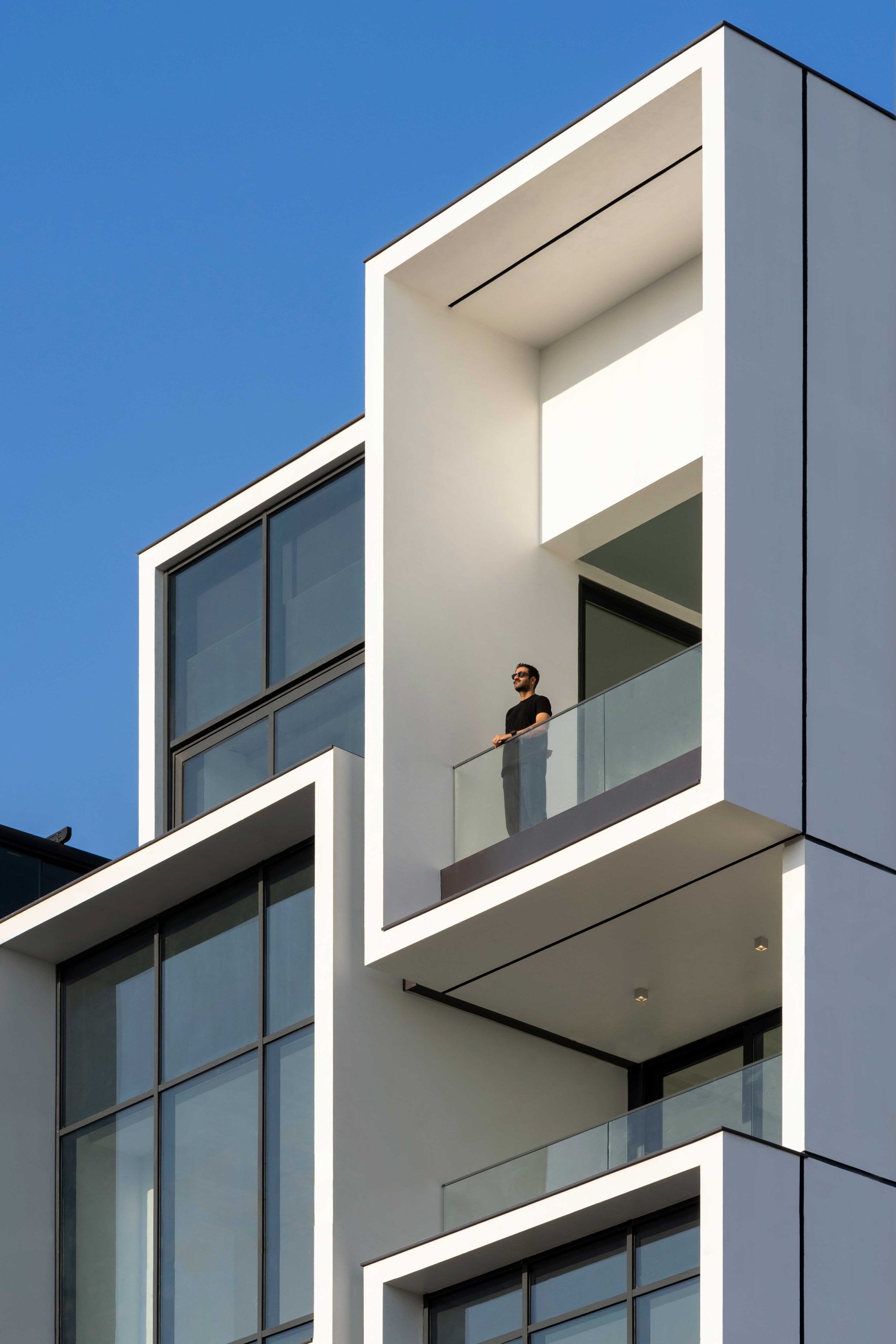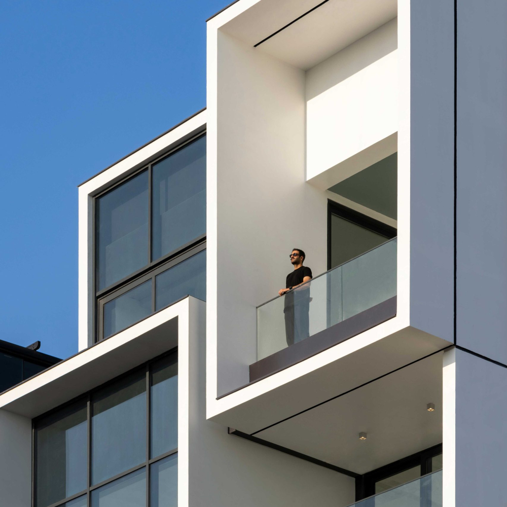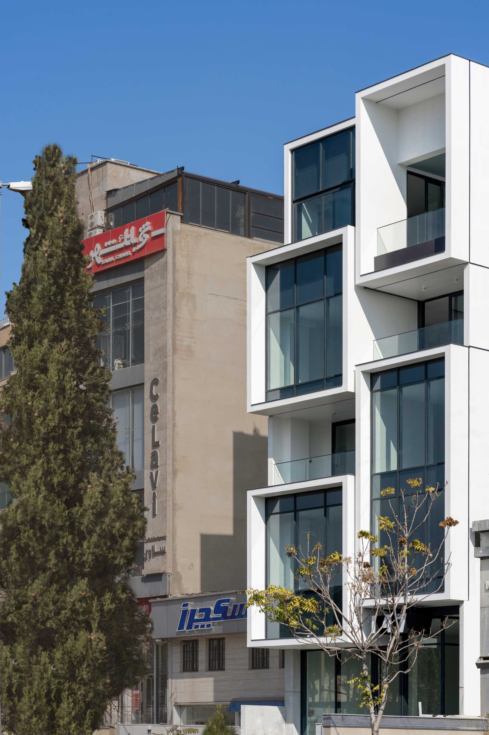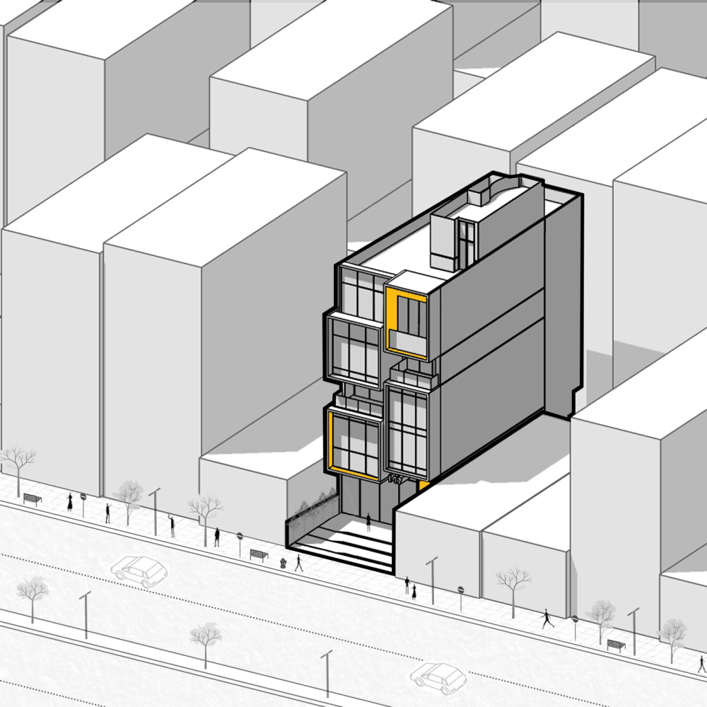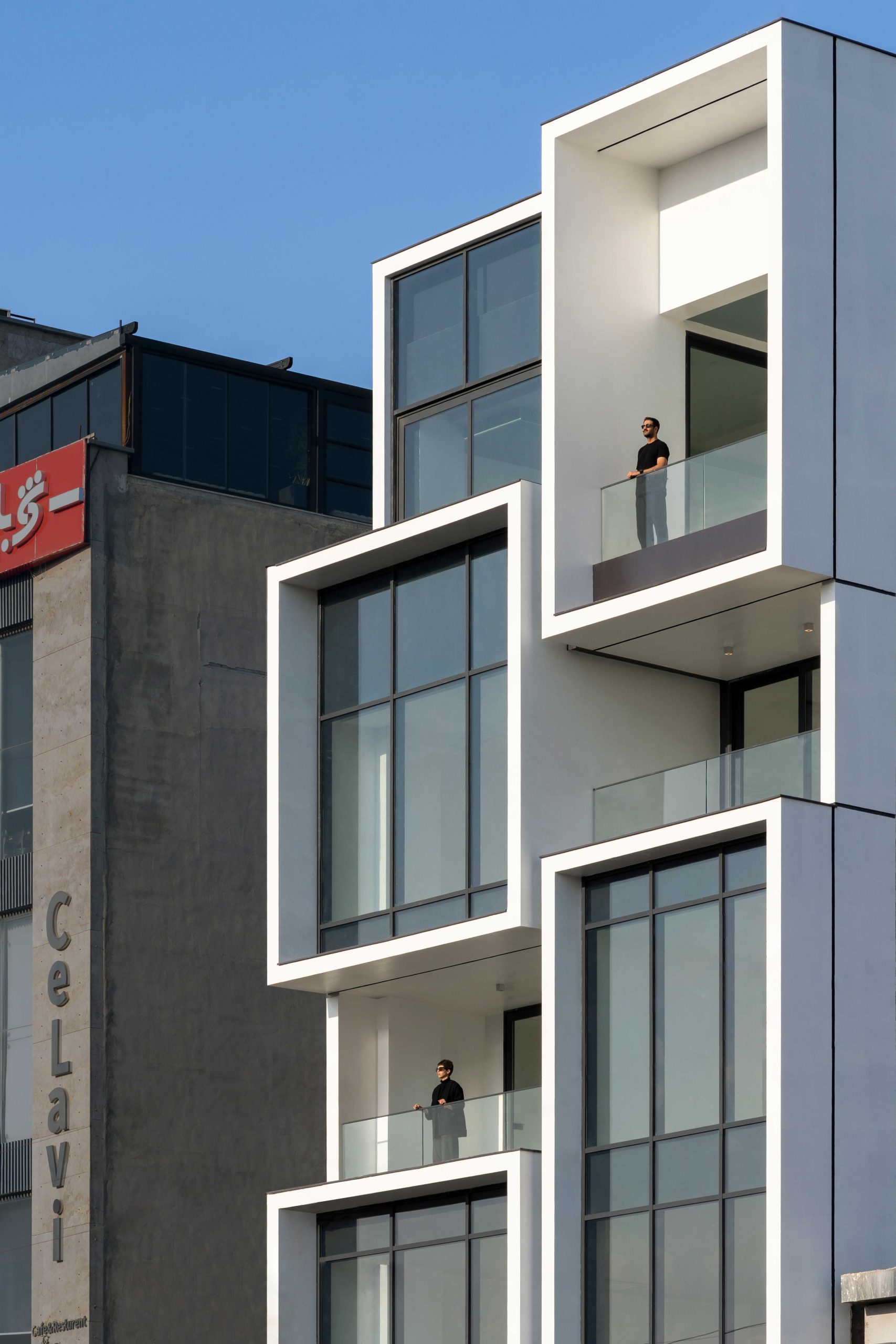 These sectional divisions were framed within continuous white boxes, and by dissolving the rigid horizontal separations between floors inside these frames, the design aimed to generate spatial variability and diverse openings toward the street and the garden beyond. On the uppermost level, the absence of a completed structural frame provided the opportunity for further setbacks and larger semi-open terraces, offering open and transitional spaces for light, air, and interaction.