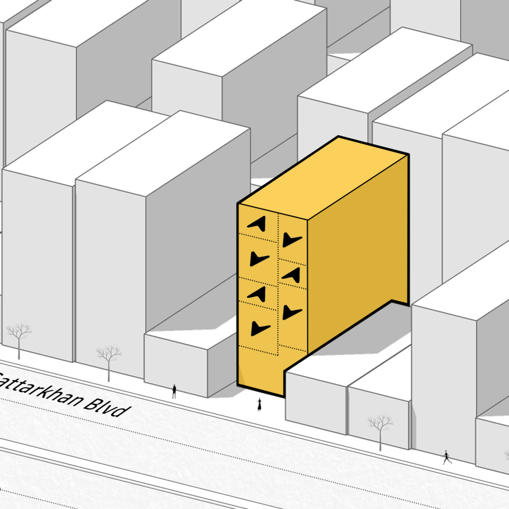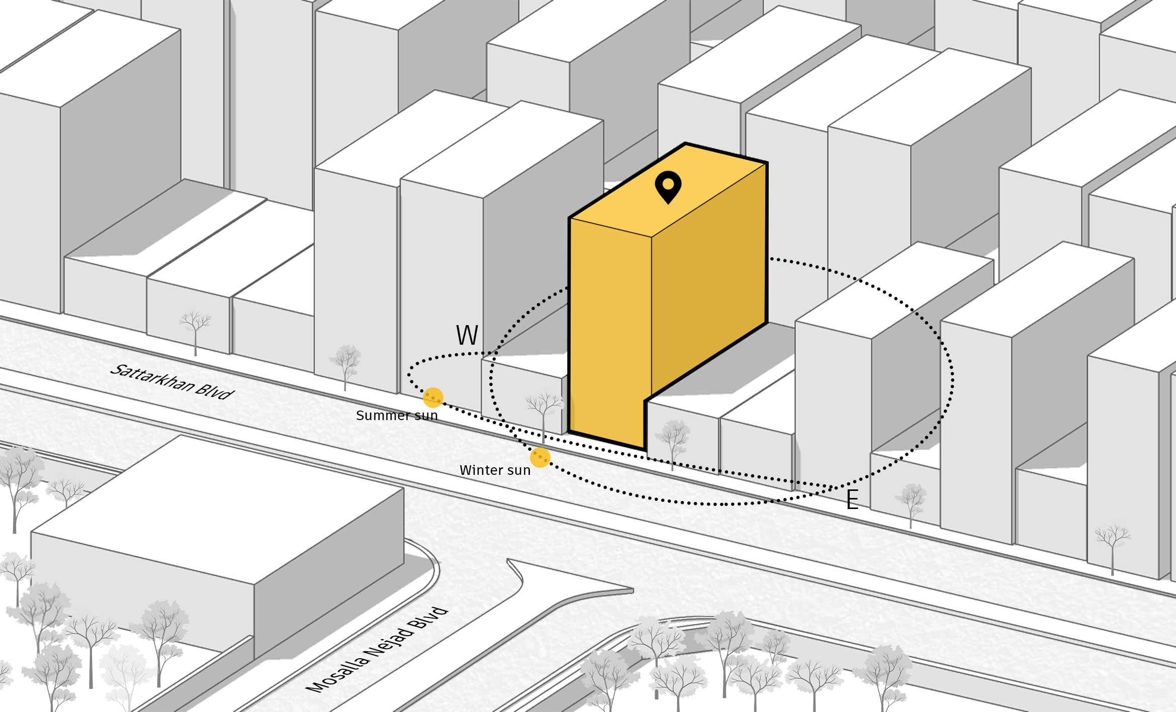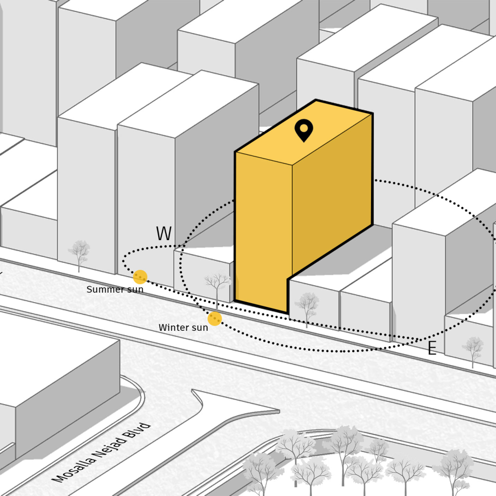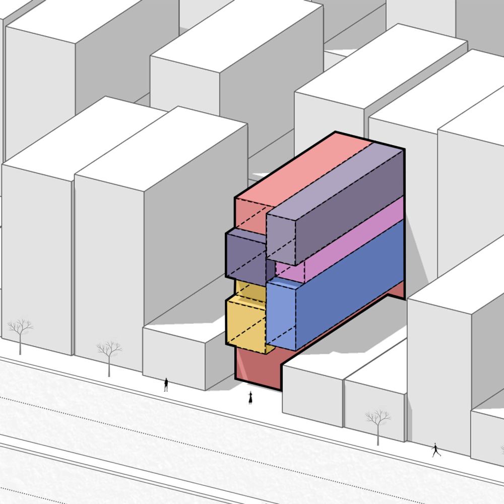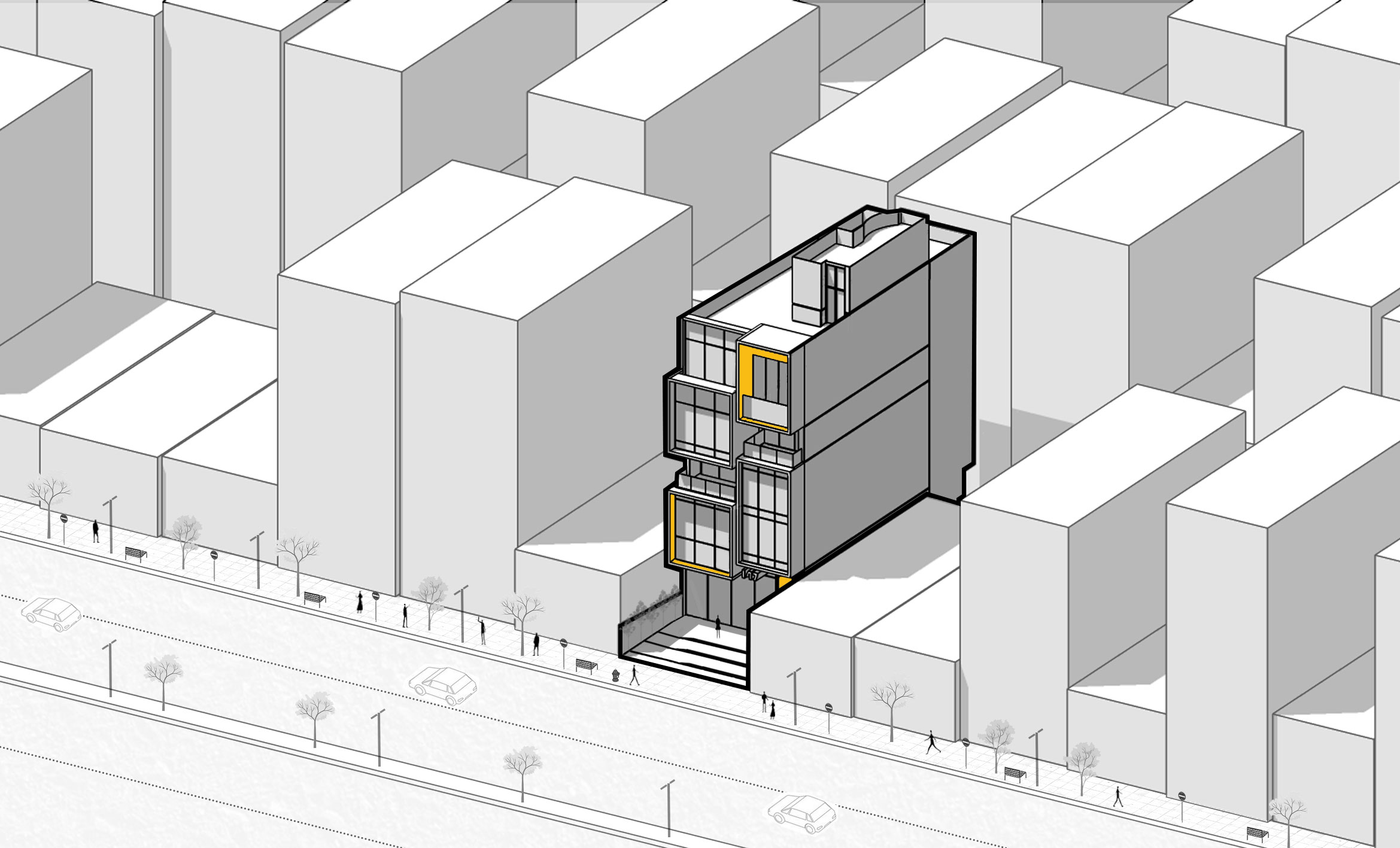Given the elongated proportions of the site and the pre-constructed skeletal frame, the design challenge centered on deepening the building’s façade and creating a meaningful spatial dialogue with the city and the gardens across the street. To address this, the building’s volume was divided longitudinally into two main segments, allowing for deep terraces to alternate between the eastern and western façades. This strategy not only enhanced the façade’s spatial depth but also introduced a layered and dynamic quality to the massing.