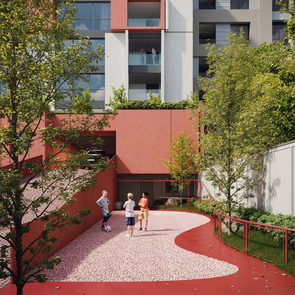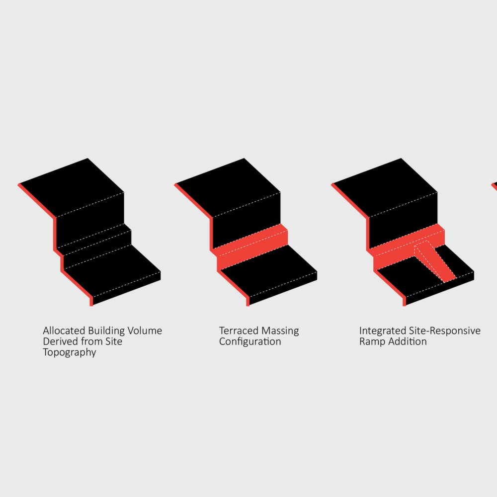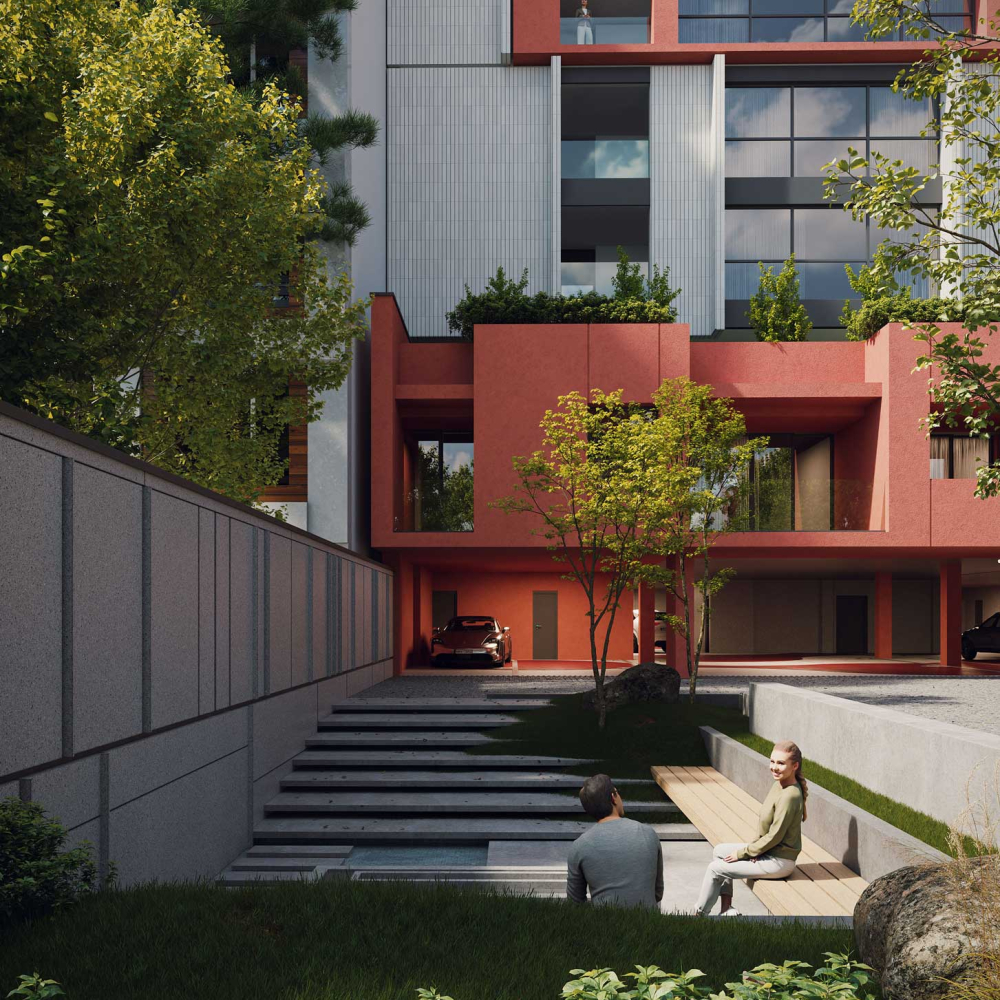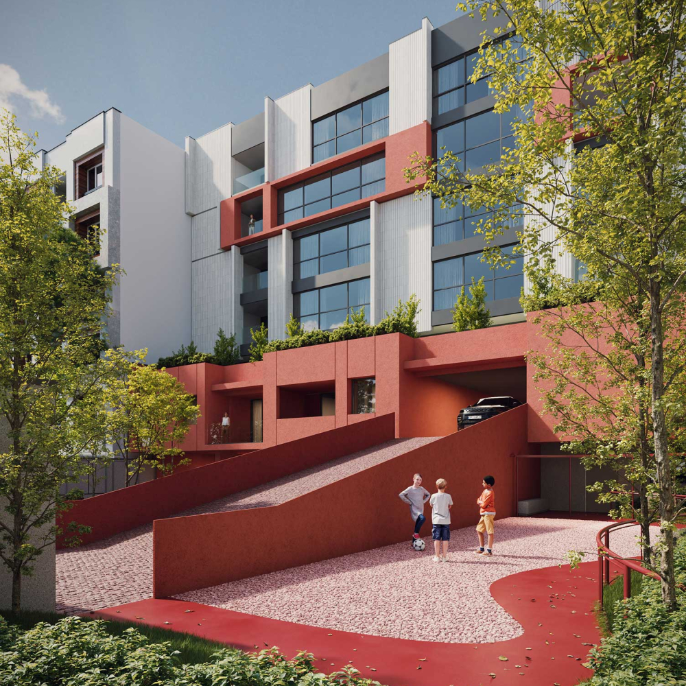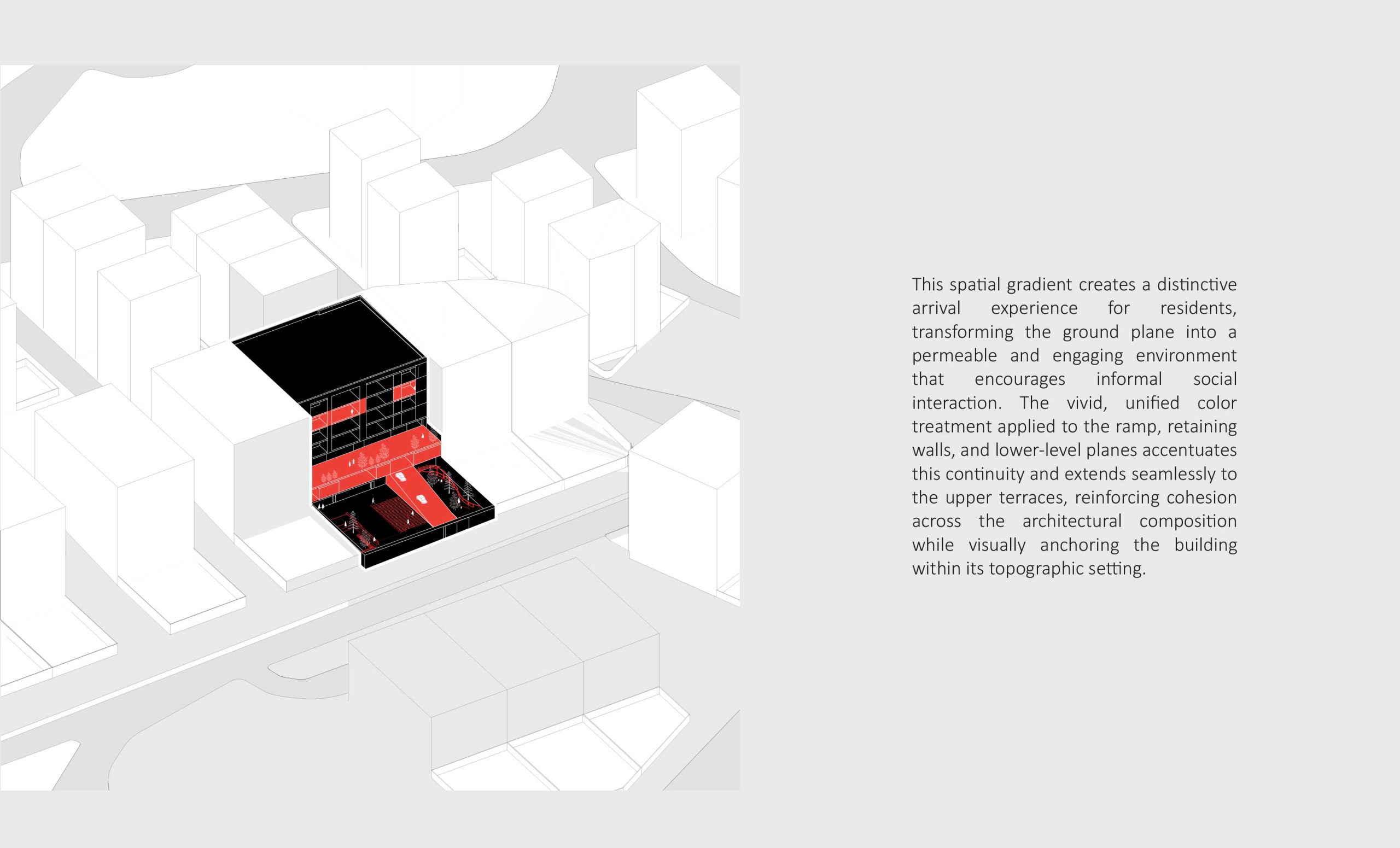 The design emphasizes the interplay between the terraced volumes and the pilotis-supported ground level by orchestrating a continuous spatial sequence that extends from the landscape to the add-on ramp and upward toward the stepped massing. This spatial gradient creates a distinctive arrival experience for residents, transforming the ground plane into a permeable and engaging environment that encourages informal social interaction. The vivid, unified color treatment applied to the ramp, retaining walls, and lower-level planes accentuates this continuity and extends seamlessly to the upper terraces, reinforcing cohesion across the architectural composition while visually anchoring the building within its topographic setting.