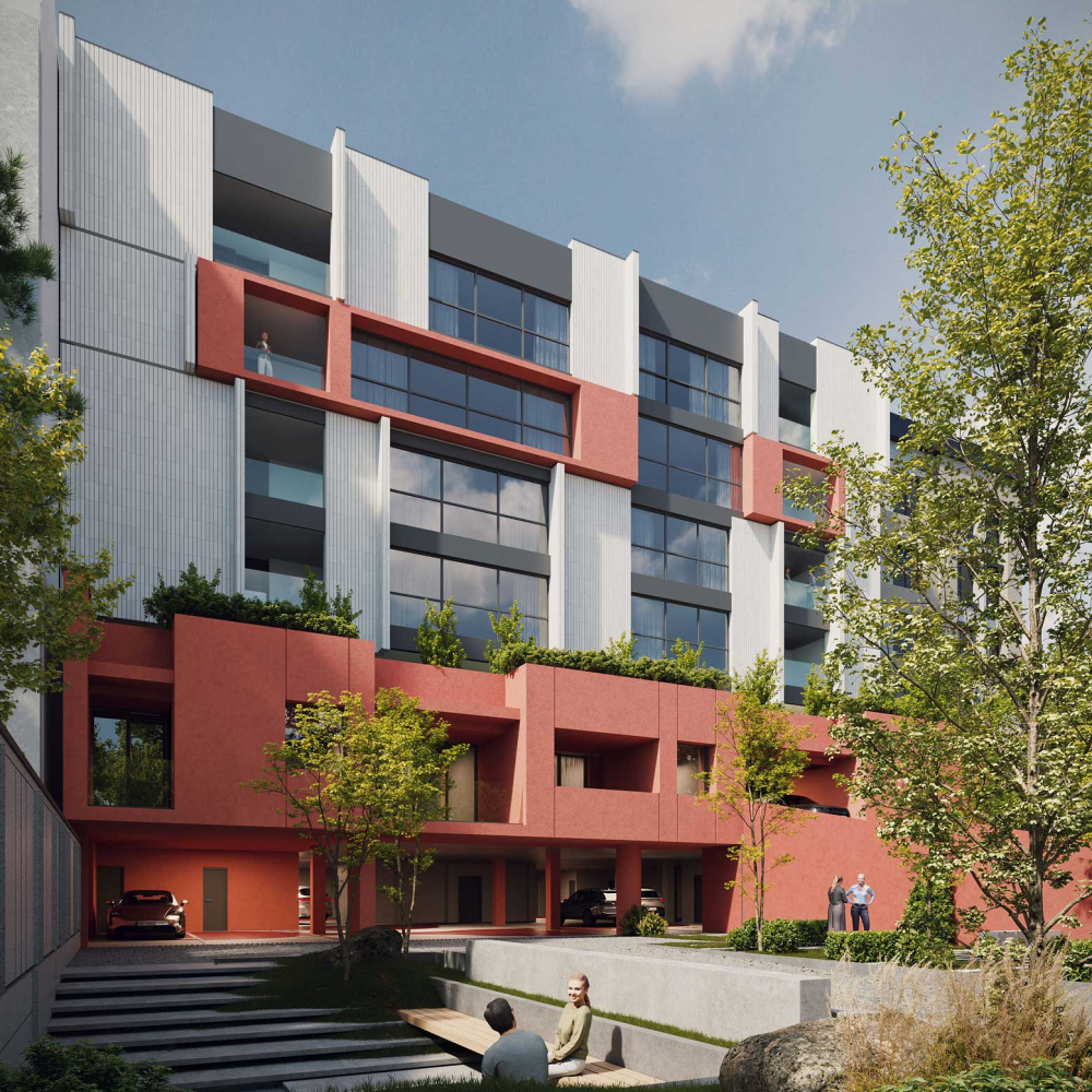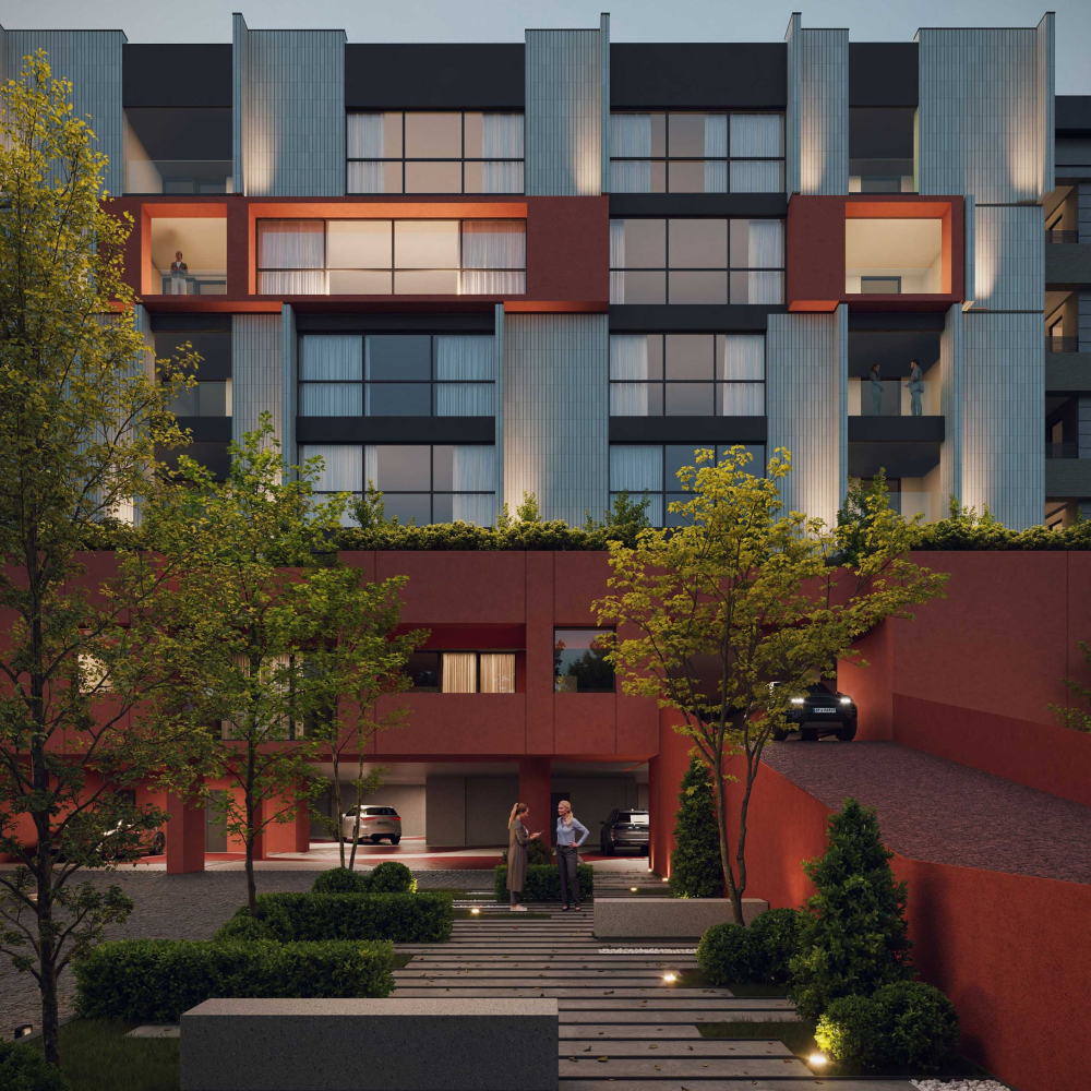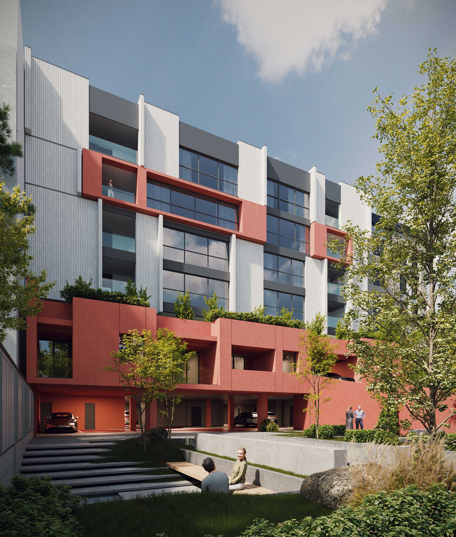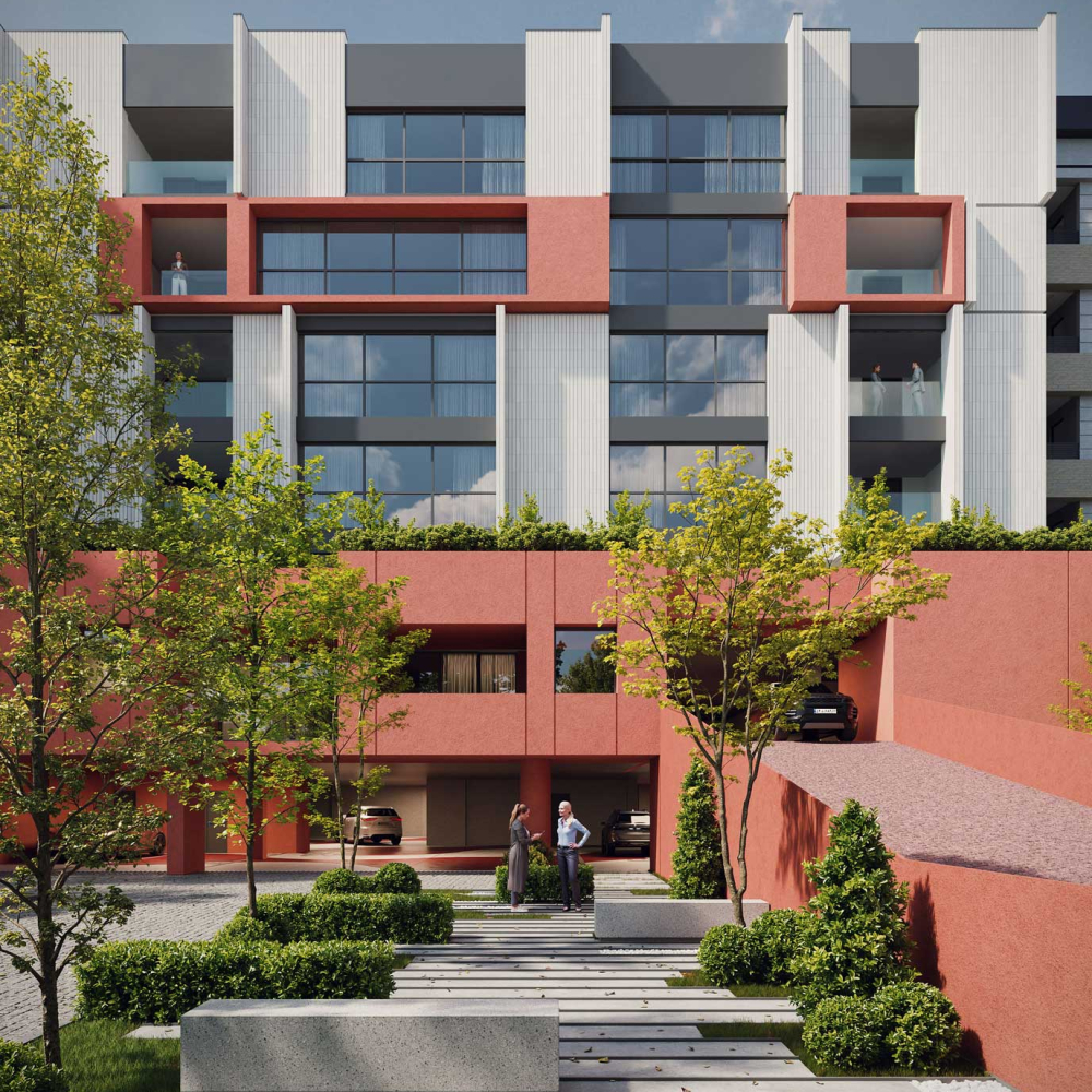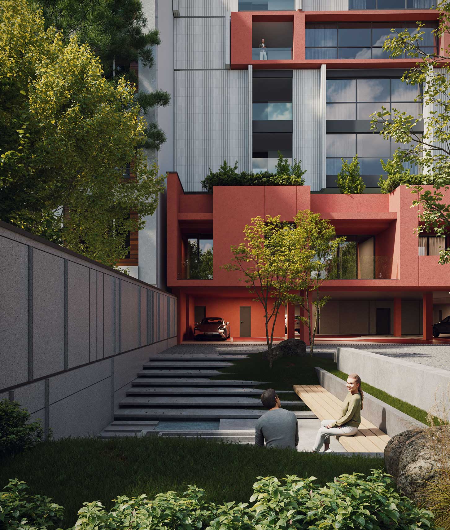 The design emphasizes the interplay between the terraced volumes and the pilotis-supported ground level by orchestrating a continuous spatial sequence that extends from the landscape to the add-on ramp and upward toward the stepped massing. This spatial gradient creates a distinctive arrival experience for residents, transforming the ground plane into a permeable and engaging environment that encourages informal social interaction. The vivid, unified color treatment applied to the ramp, retaining walls, and lower-level planes accentuates this continuity and extends seamlessly to the upper terraces, reinforcing cohesion across the architectural composition while visually anchoring the building within its topographic setting.