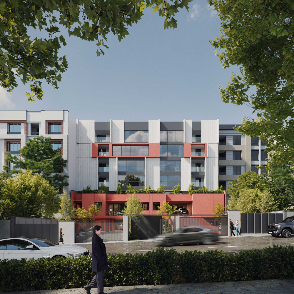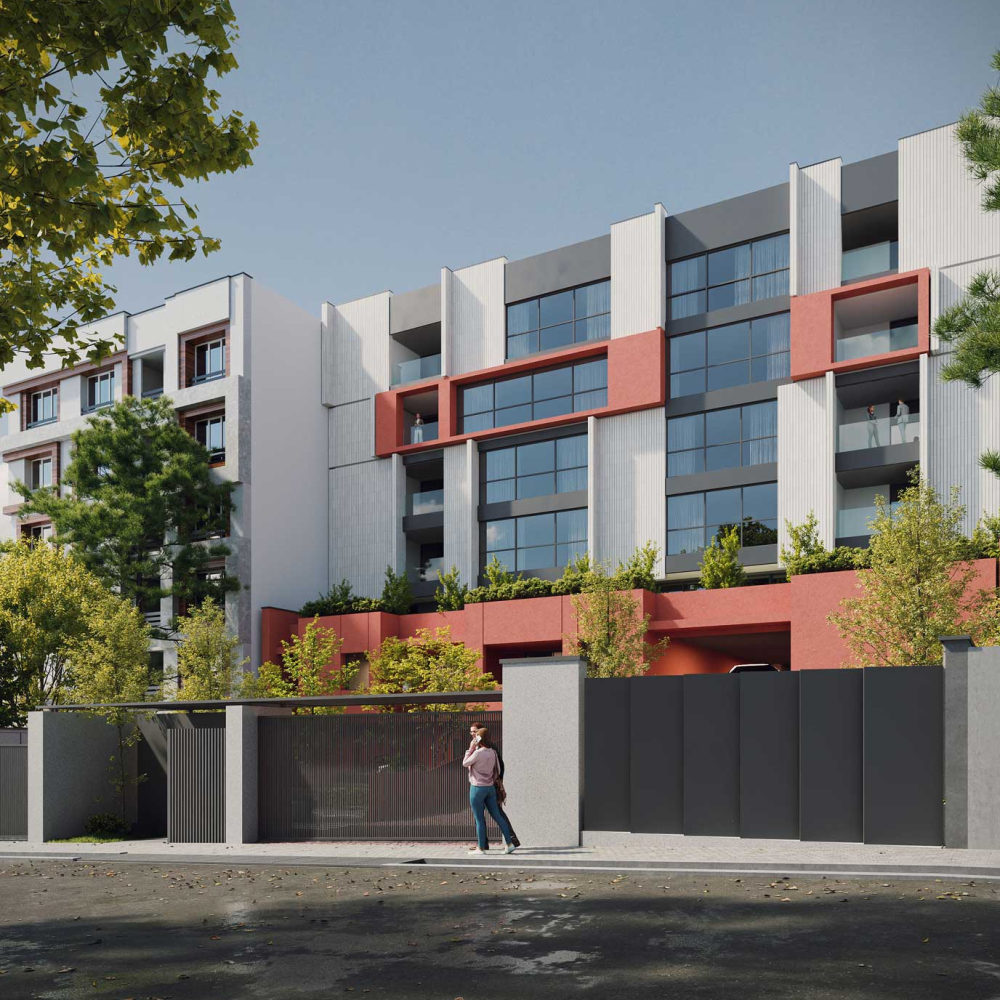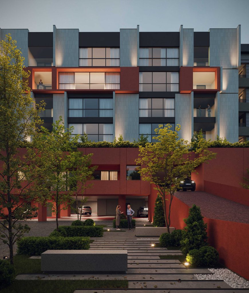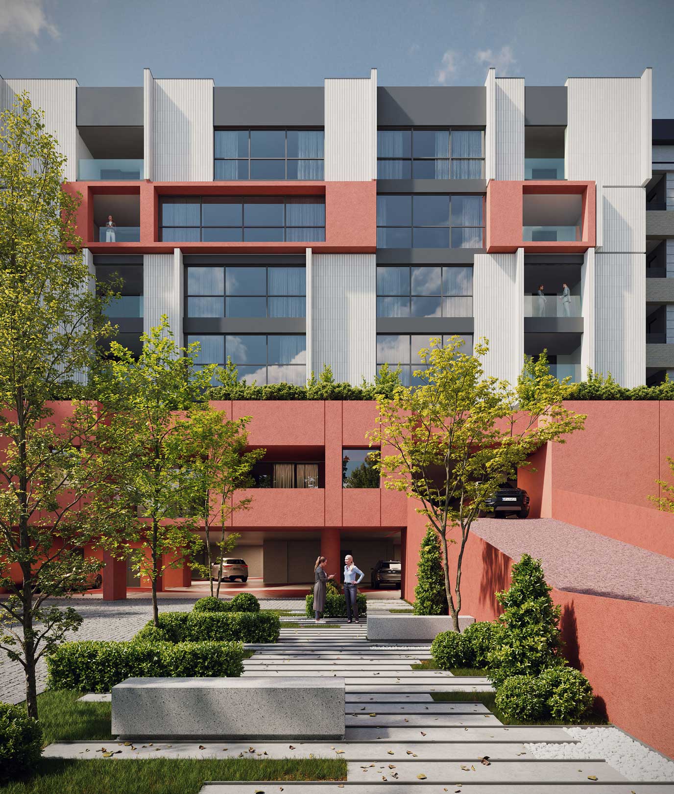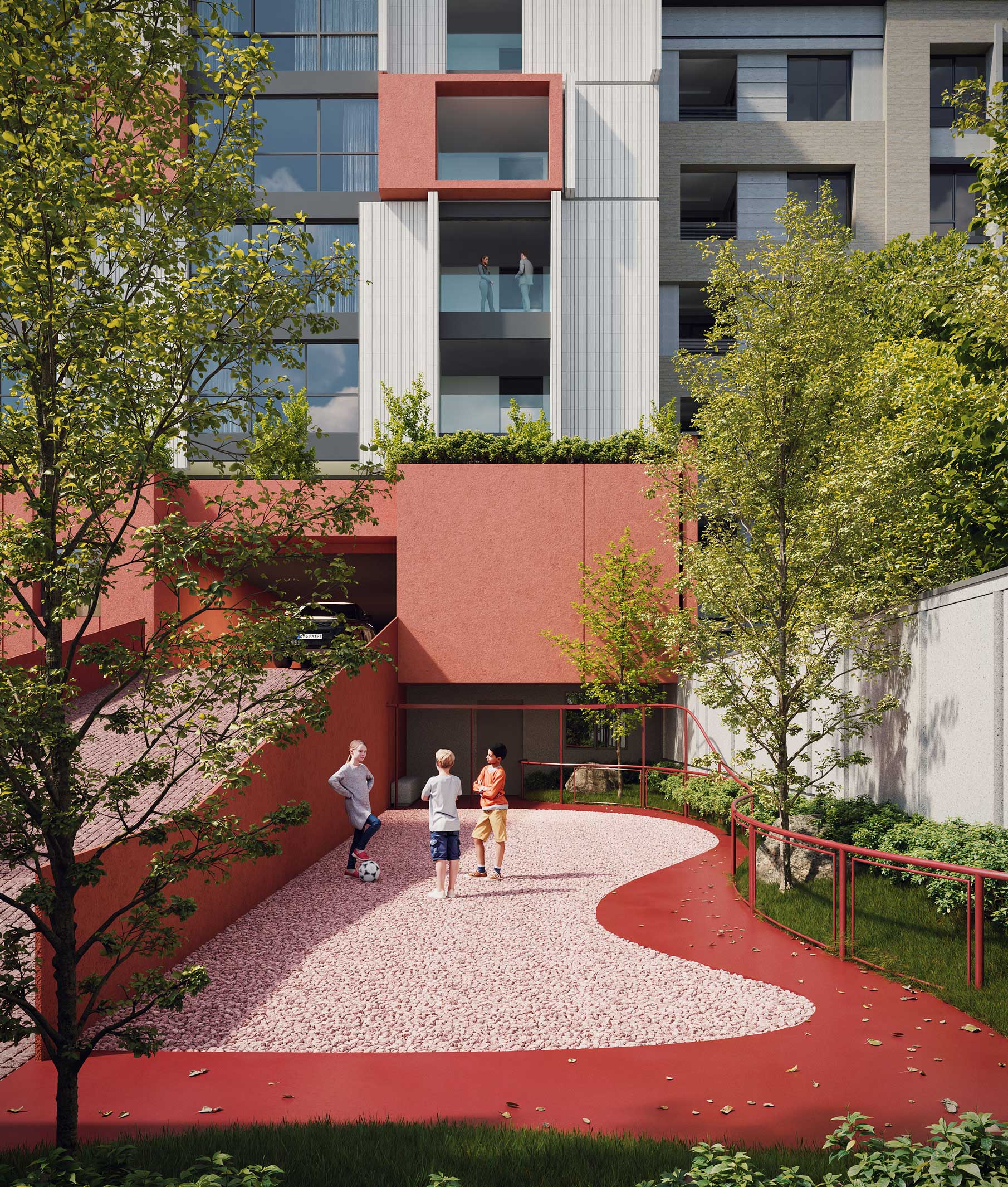 The design emphasizes the interplay between the terraced volumes and the pilotis-supported ground level by orchestrating a continuous spatial sequence that extends from the landscape to the add-on ramp and upward toward the stepped massing. This spatial gradient creates a distinctive arrival experience for residents, transforming the ground plane into a permeable and engaging environment that encourages informal social interaction. The vivid, unified color treatment applied to the ramp, retaining walls, and lower-level planes accentuates this continuity and extends seamlessly to the upper terraces, reinforcing cohesion across the architectural composition while visually anchoring the building within its topographic setting.