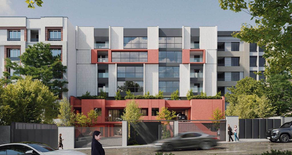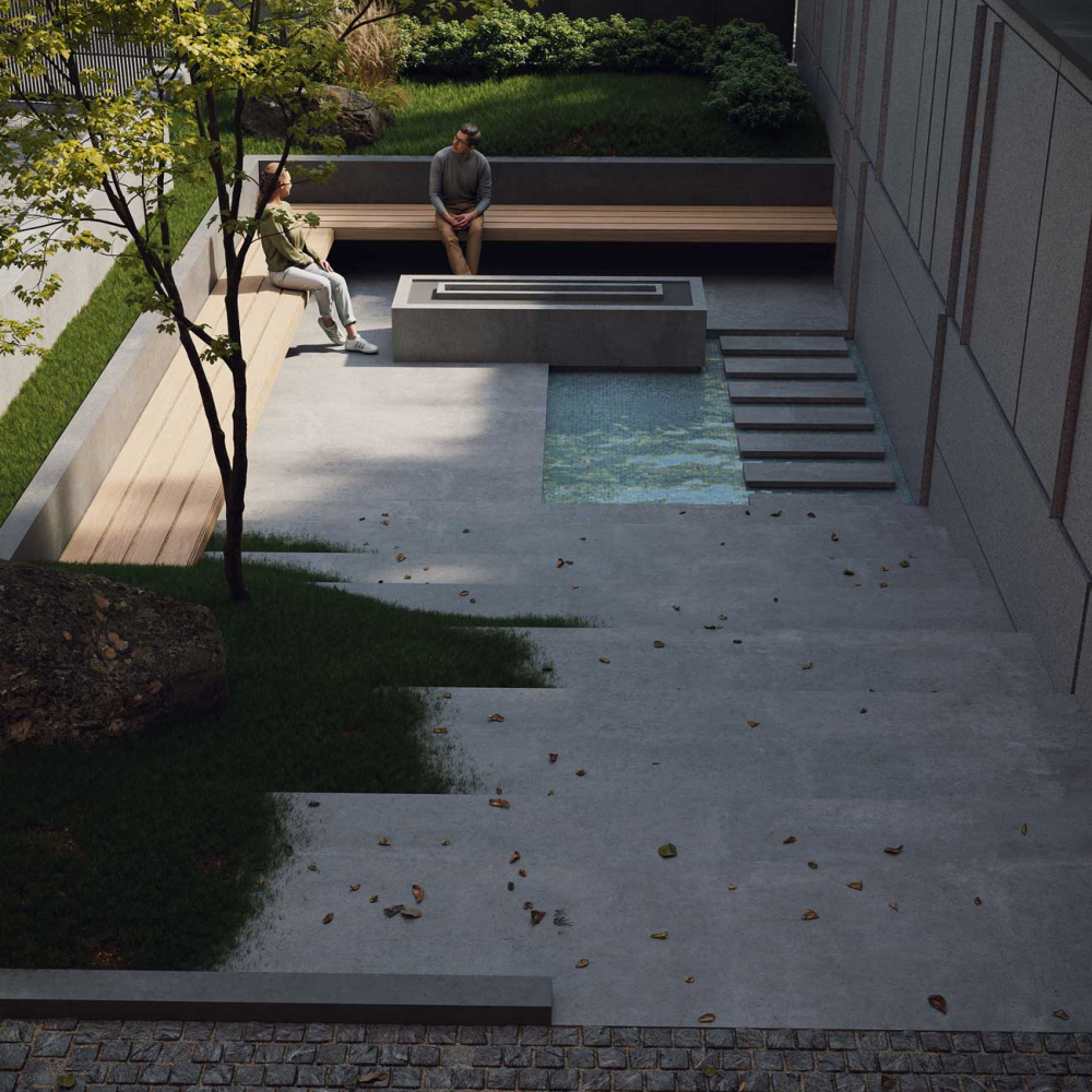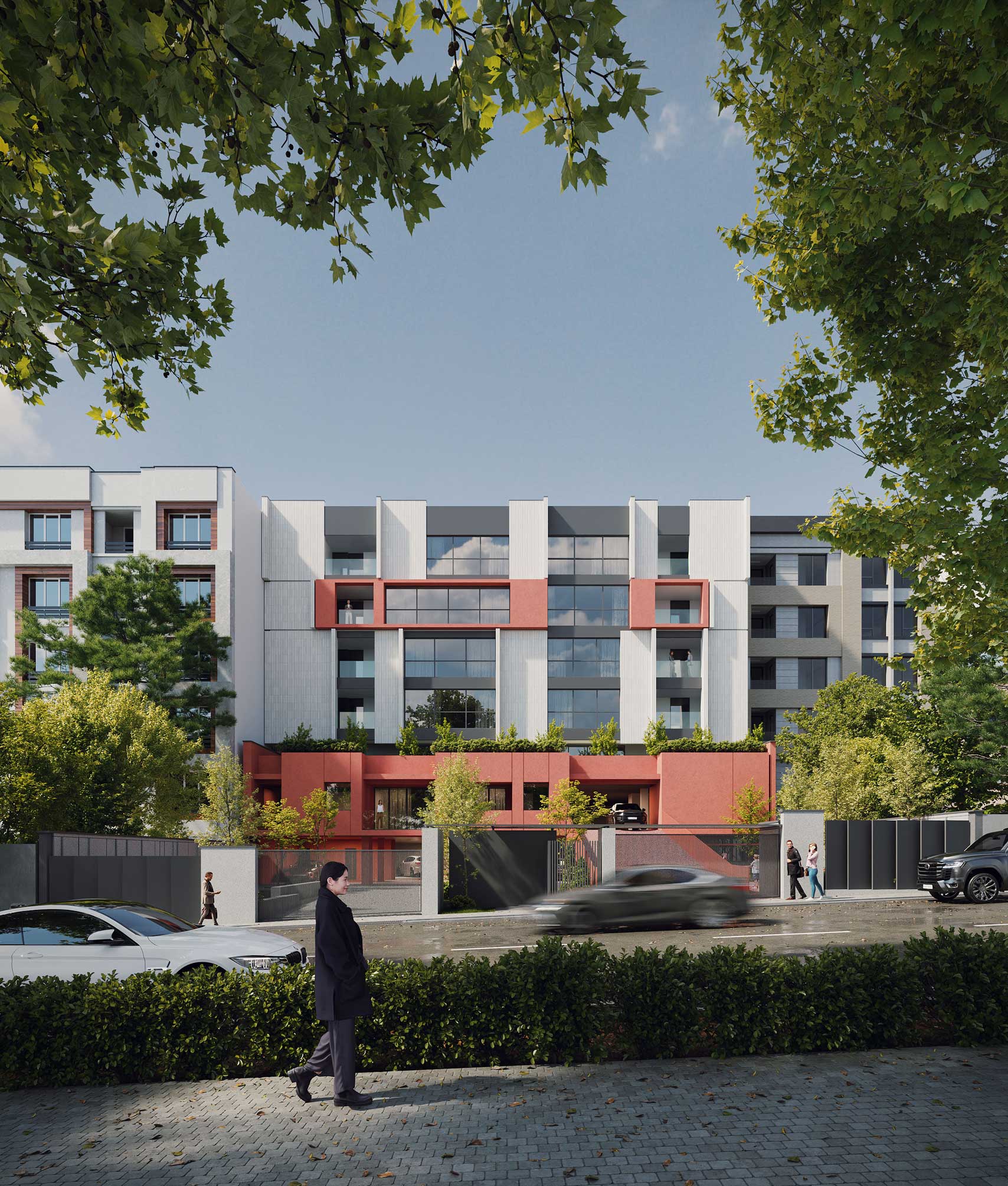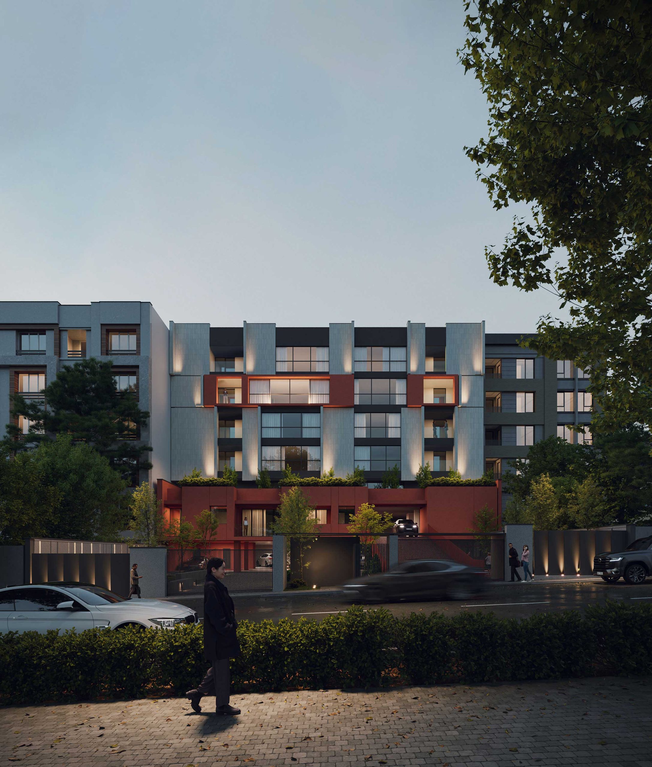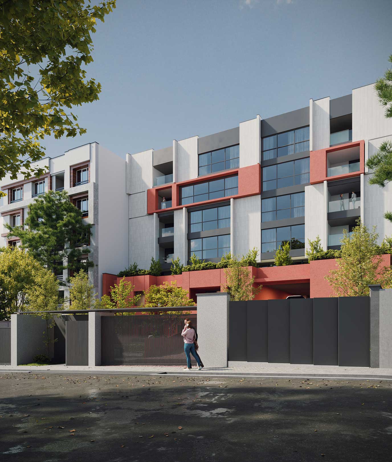 The design emphasizes the interplay between the terraced volumes and the pilotis-supported ground level by orchestrating a continuous spatial sequence that extends from the landscape to the add-on ramp and upward toward the stepped massing. This spatial gradient creates a distinctive arrival experience for residents, transforming the ground plane into a permeable and engaging environment that encourages informal social interaction. The vivid, unified color treatment applied to the ramp, retaining walls, and lower-level planes accentuates this continuity and extends seamlessly to the upper terraces, reinforcing cohesion across the architectural composition while visually anchoring the building within its topographic setting.