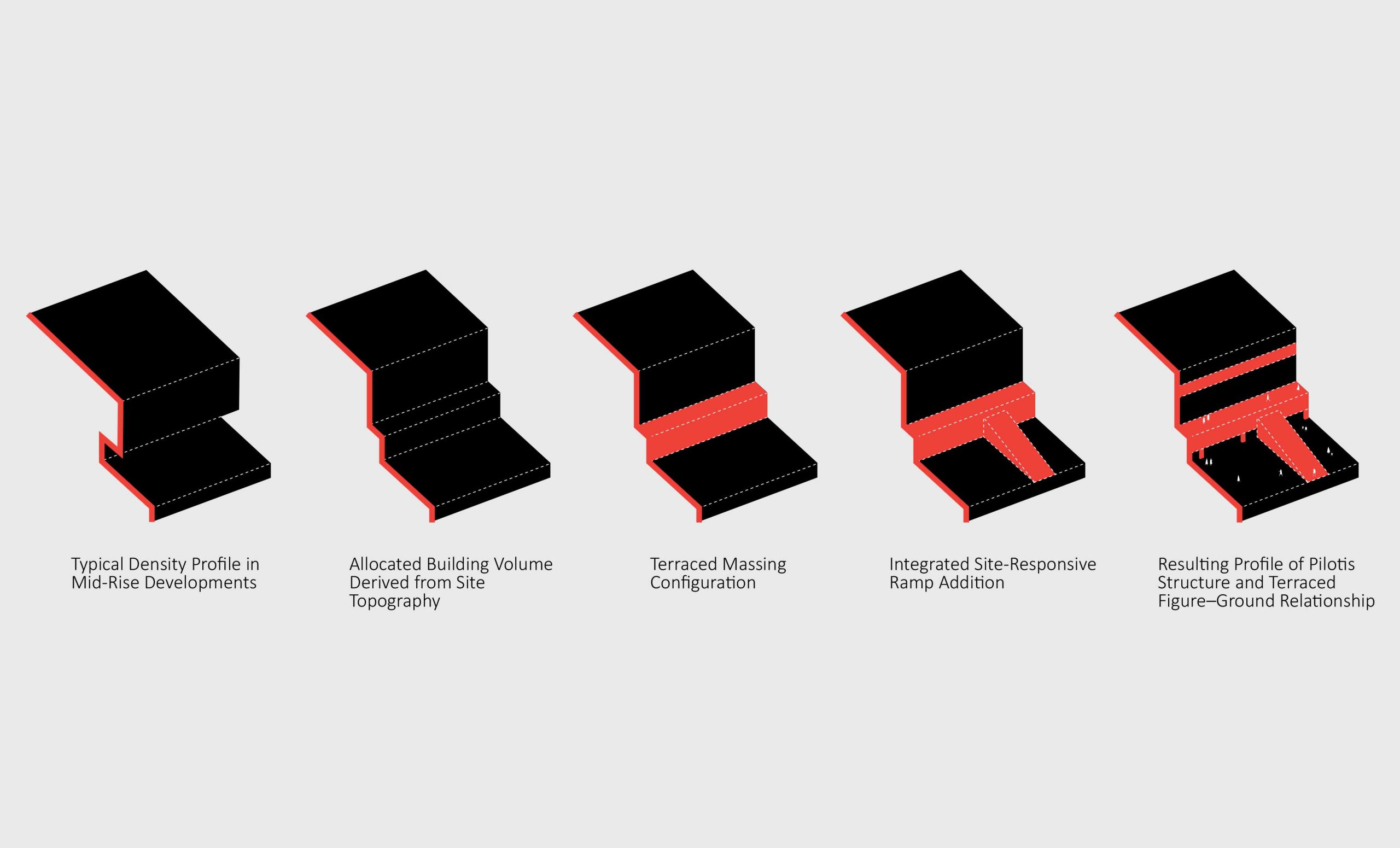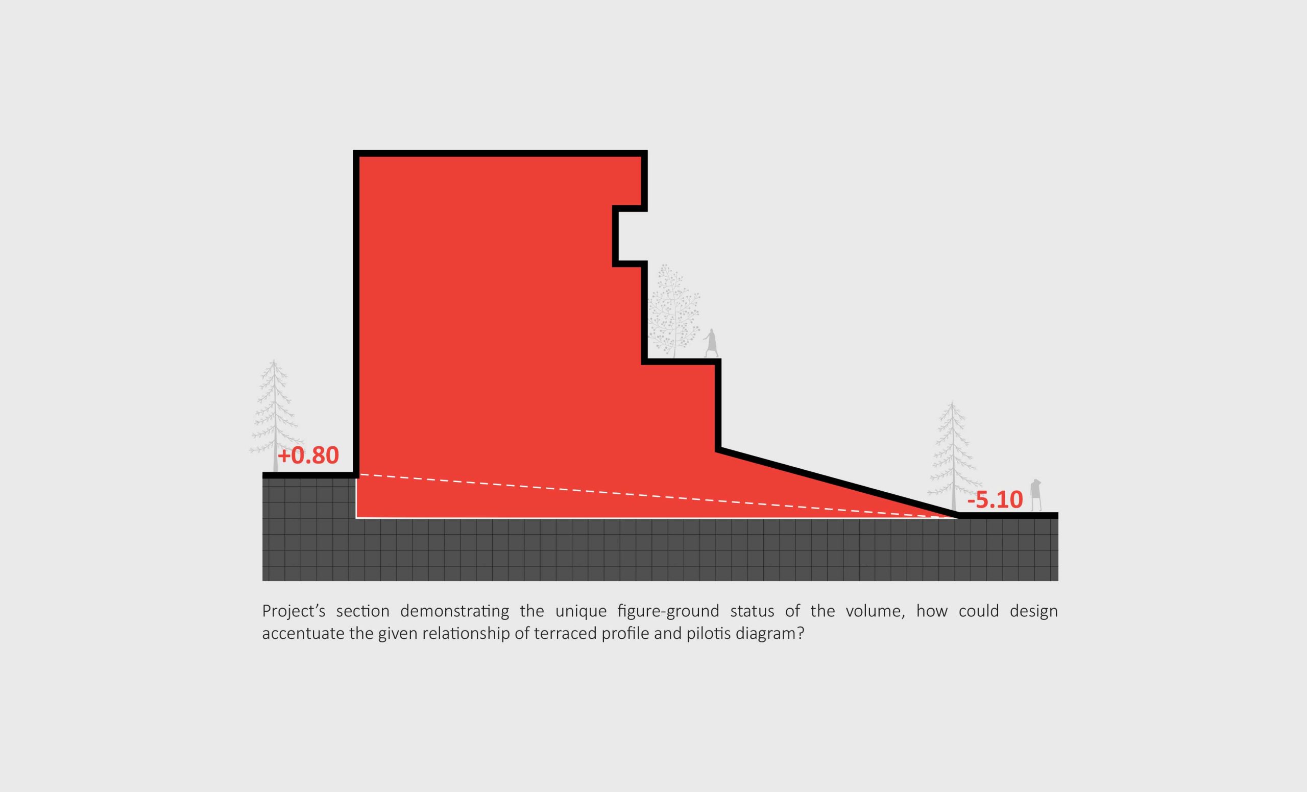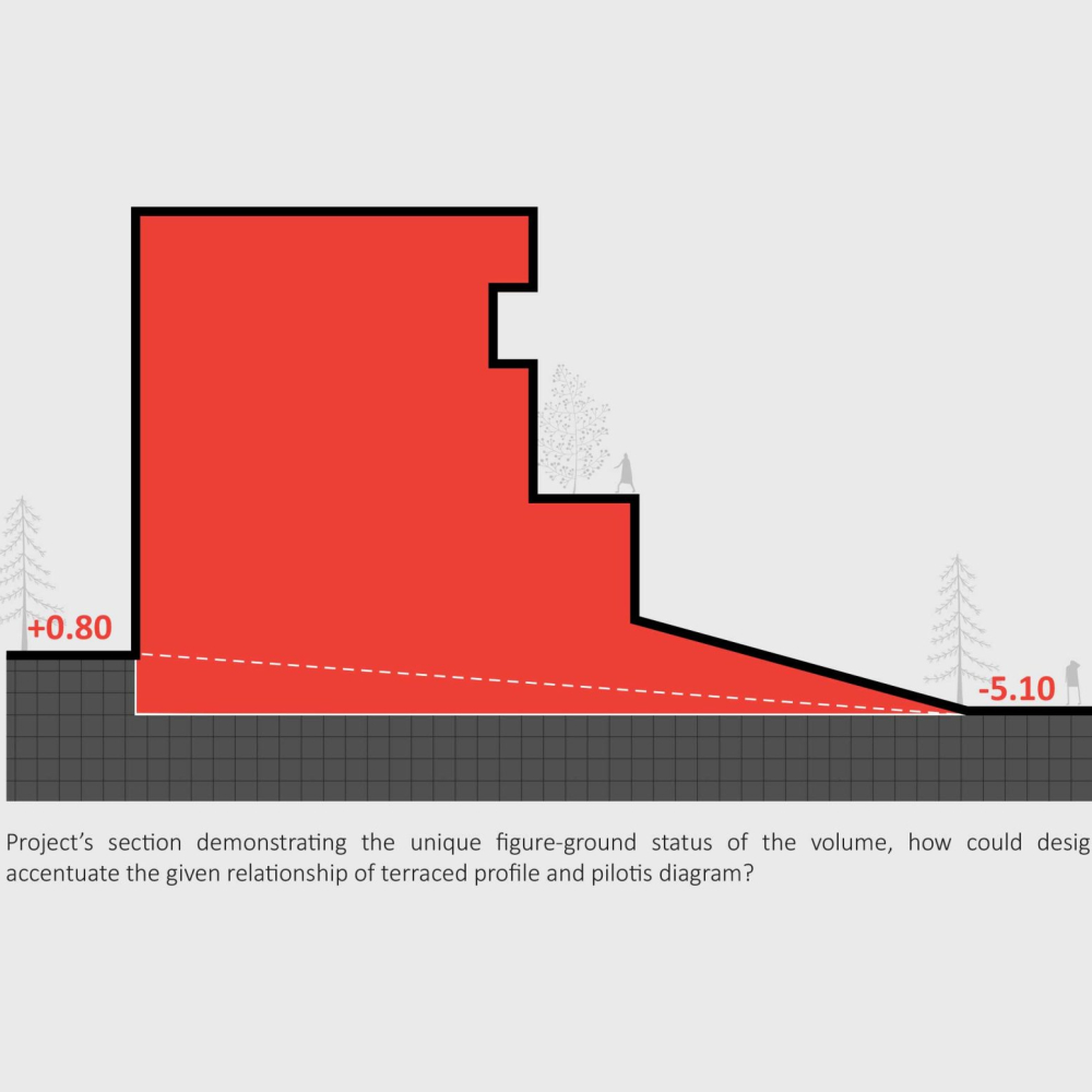 Project’s section demonstrating the unique figure-ground status of the volume, how could design accentuate the given relationship of terraced profile and pilotis diagram?